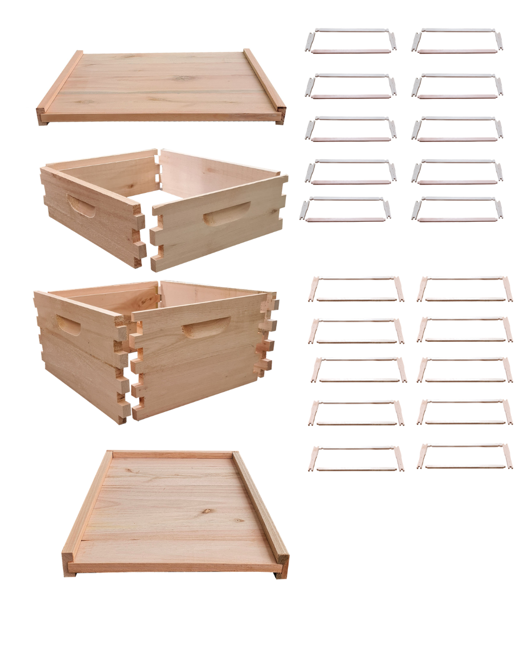 O modelo desmontado facilita o armazenamento e o envio, além de permitir montagem rápida e precisa. Acompanha todos os componentes necessários para a estrutura completa da colmeia, incluindo ninho, melgueira e quadros.